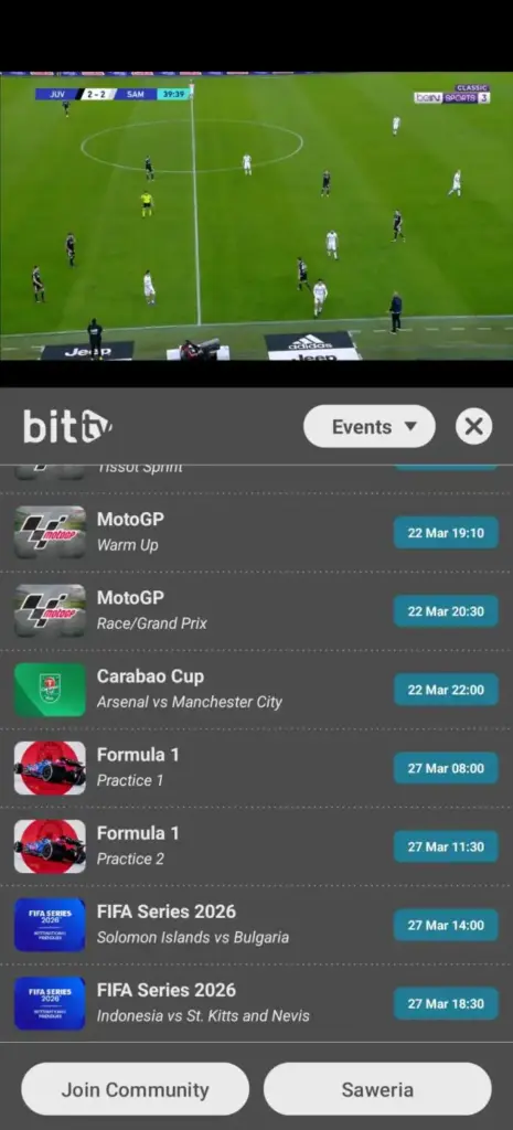 Di BitTV, acara langsung populer seperti Piala Dunia, Liga Premier, Liga Champions UEFA, Liga 1, dan Liga Champions AFC biasanya ditampilkan di bagian atas aplikasi dalam bagian khusus yang ditampilkan. Hal ini memudahkan pengguna untuk menemukan dan menonton pertandingan yang sedang tren tanpa perlu mencarinya. Anda dapat dengan cepat mengetuk acara-acara ini dan mulai streaming secara instan.